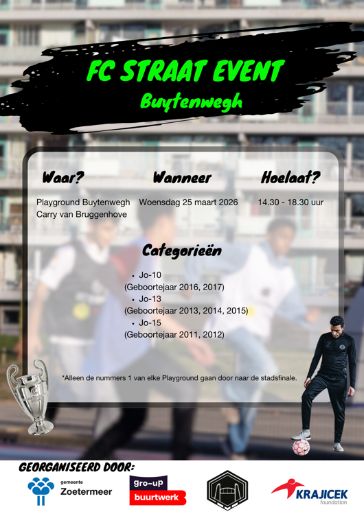 Gemeente Zoetermeer Sport, Gro-up Buurtwerk, FC Straat en de Krajicek Foundation organiseren een FC Straat event met stadsfinale: het ultieme straatvoetbaltoernooi. Doe jij mee?