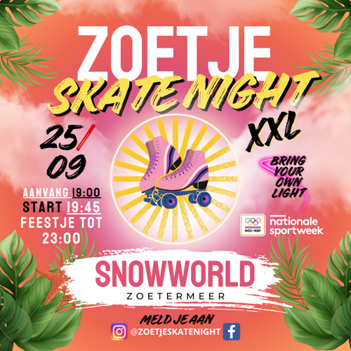 Sluit Alles op Wielen sportief én feestelijk af met de gezellige Zoetje Skatenight! Samen met andere skateliefhebbers rol je 's avonds door de straten van Zoetermeer. Skeeleren of rollerskaten, alles mag – als het maar op wieltjes is.